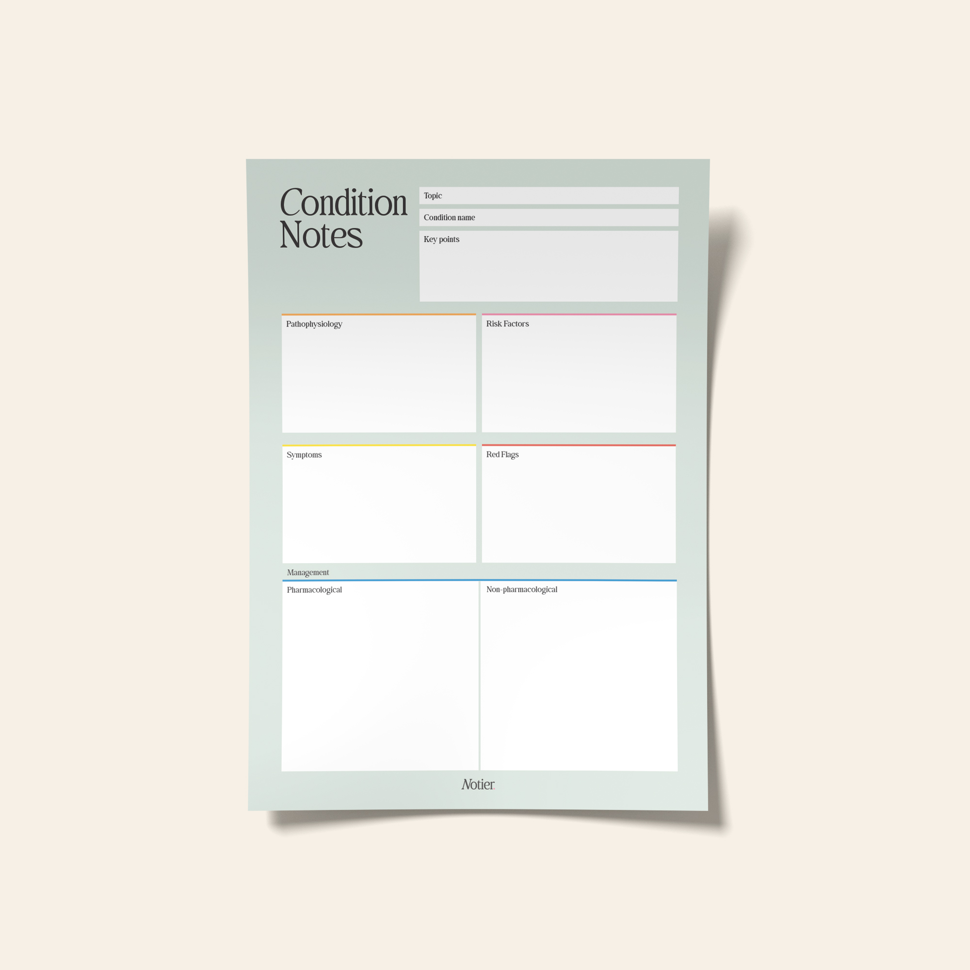 This premium silky smooth 50 page A4 notepad just made studying pharmacy a whole lot easier. With all the relevant headings on the same page, organising your notes has become much simpler. Summarise your conditions and impress your fellow students with our beautifully designed, easy-to-use notepad.
