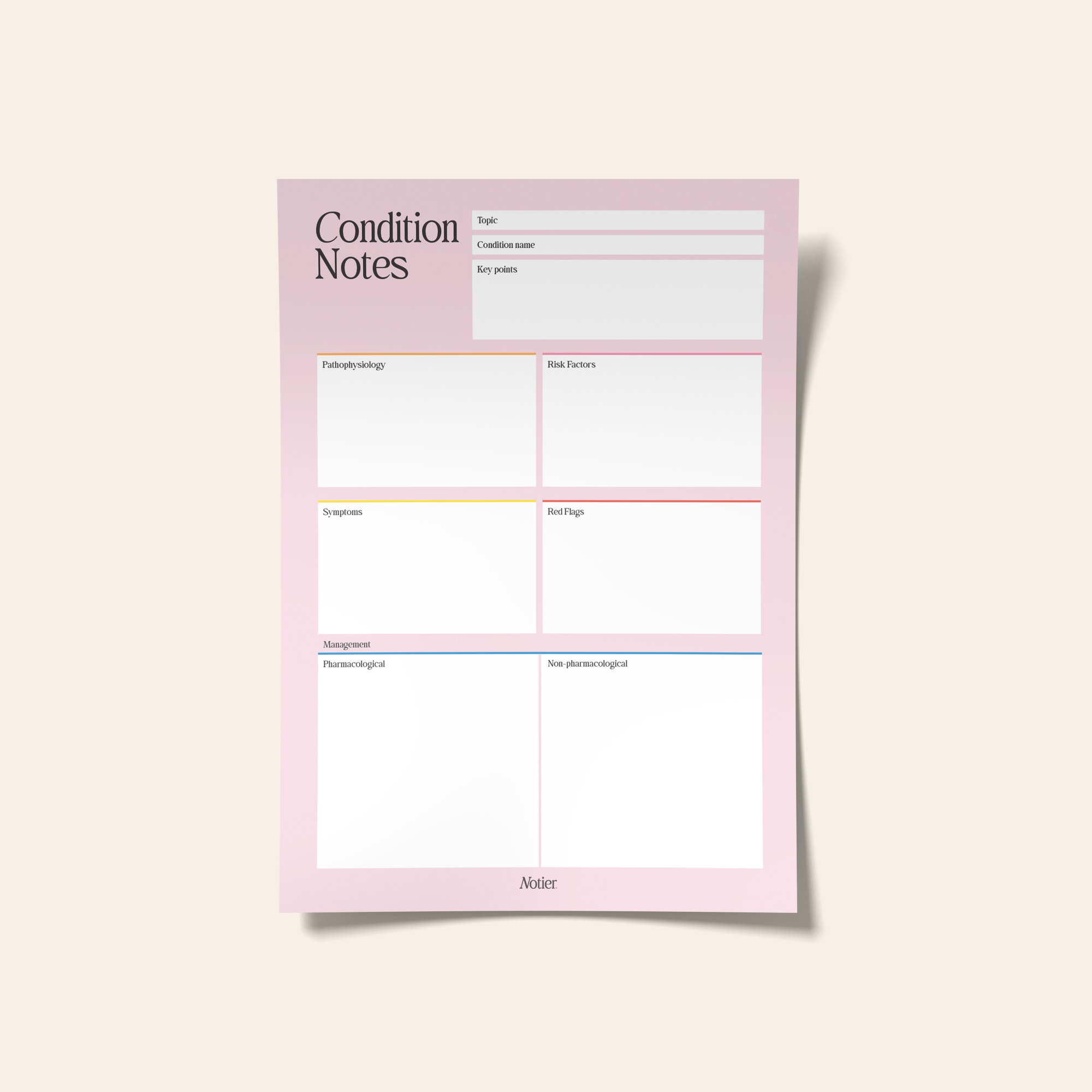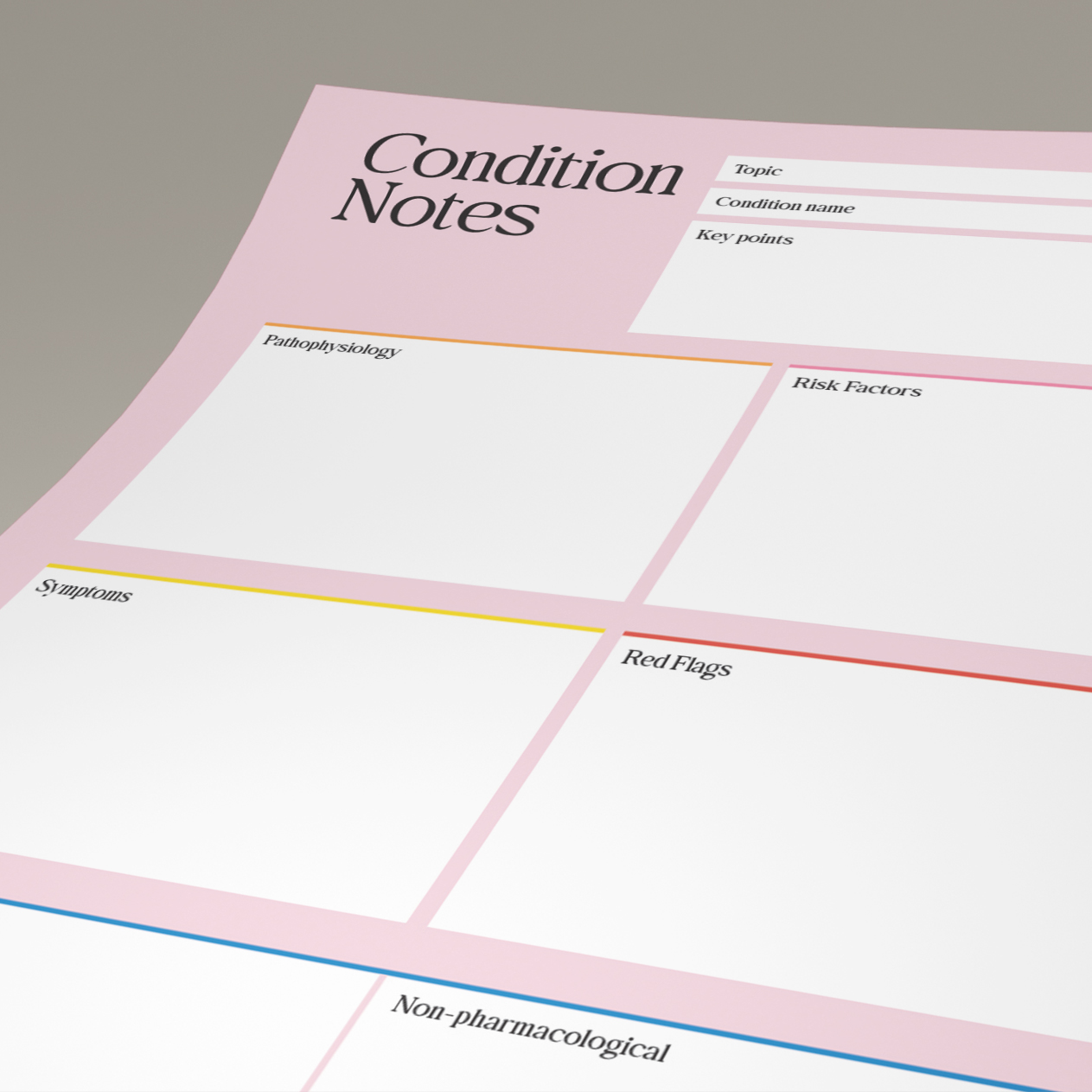This premium silky smooth 50 page A4 notepad just made studying pharmacy a whole lot easier. With all the relevant headings on the same page, organising your notes has become much simpler. Summarise your conditions and impress your fellow students with our beautifully designed, easy-to-use notepad.
