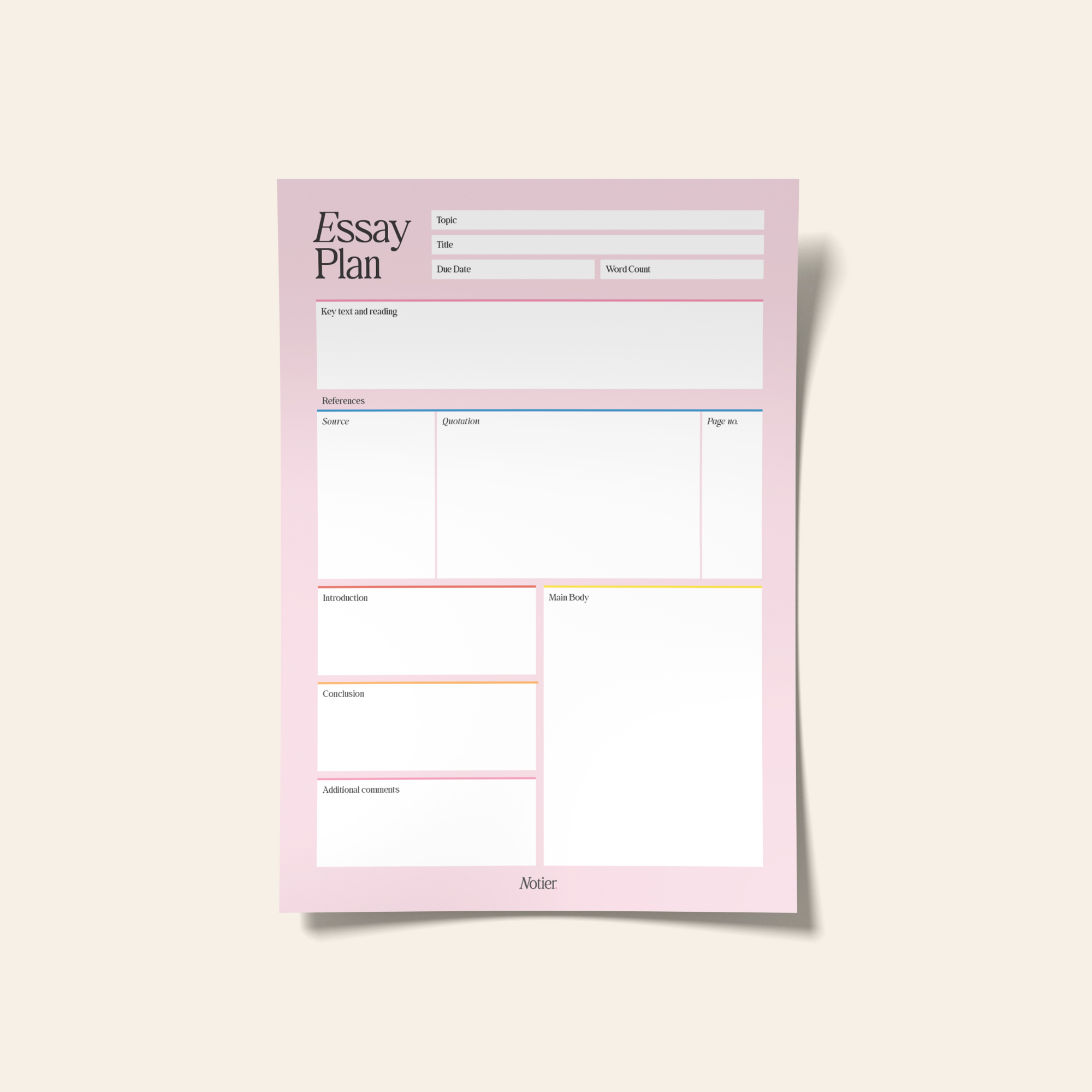 Elevate your study game with Notier bespoke note-taking pads, thoughtfully designed to help you make the most of your learning. This notepad offers 50 stunning, premium, glossy A4 pages, crafted with premium, sustainably sourced paper, we prioritise quality and our planet. The essay plan notepad has been designed for students for all essay-based subjects. Organise the way you plan your essays by getting all your ideas down on one pre-formatted page. This notepad transforms the way you research your title and makes studying more efficient.